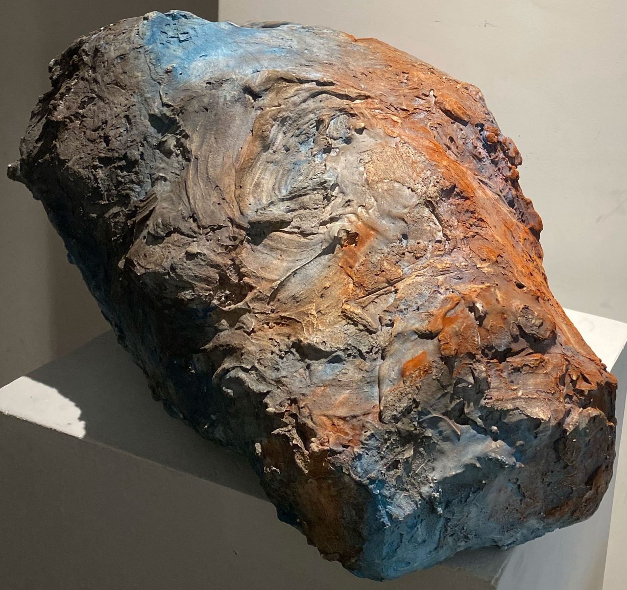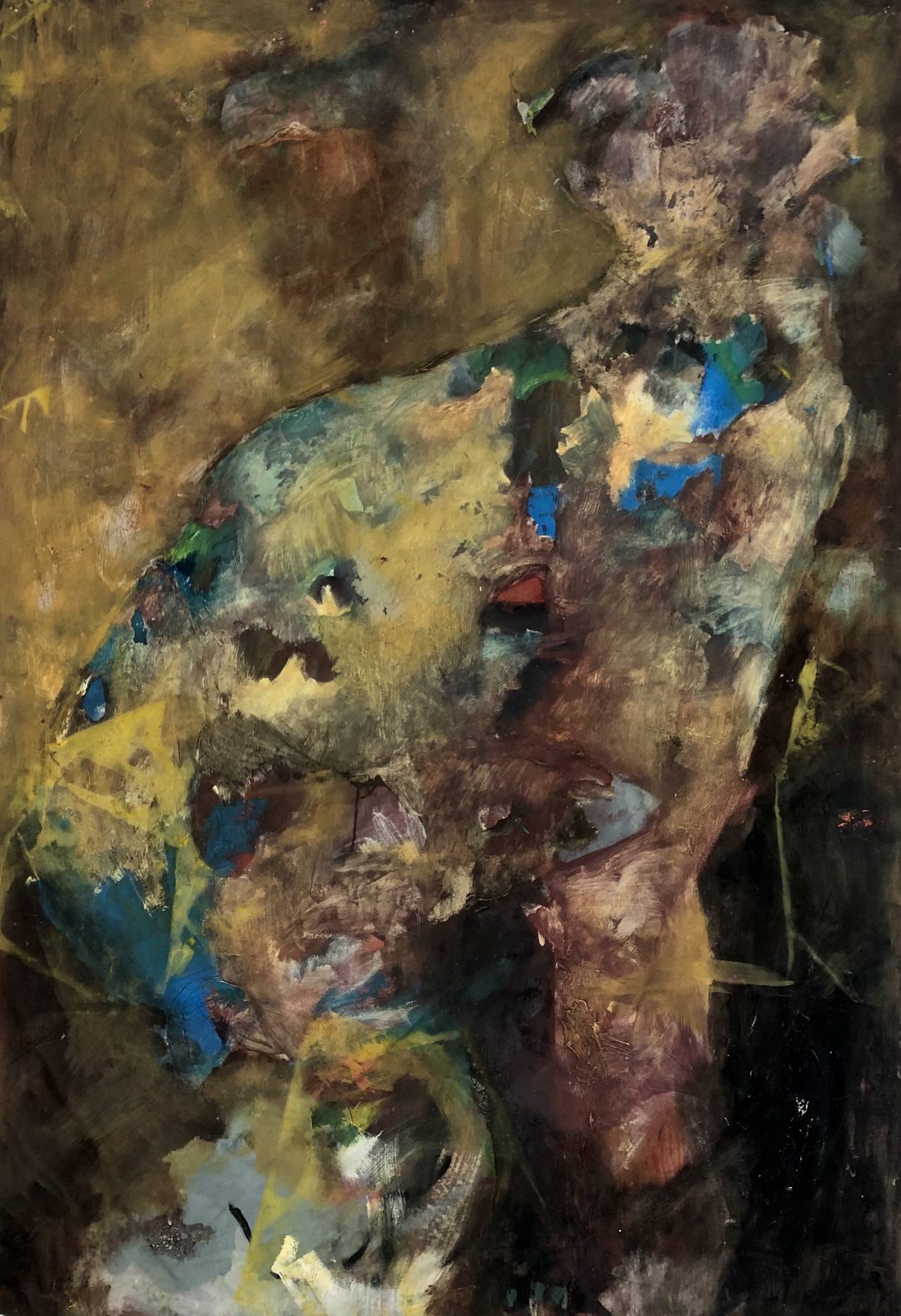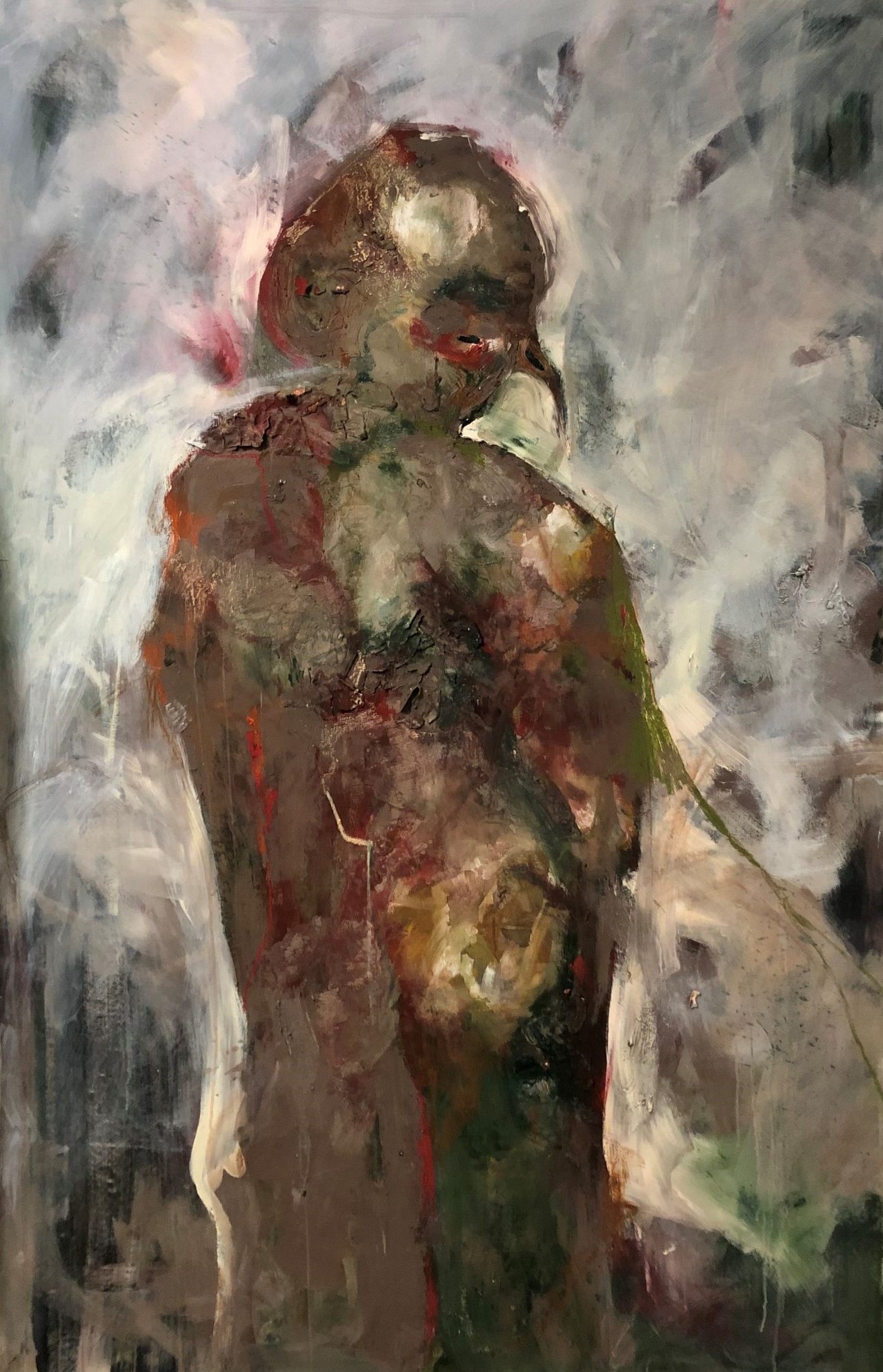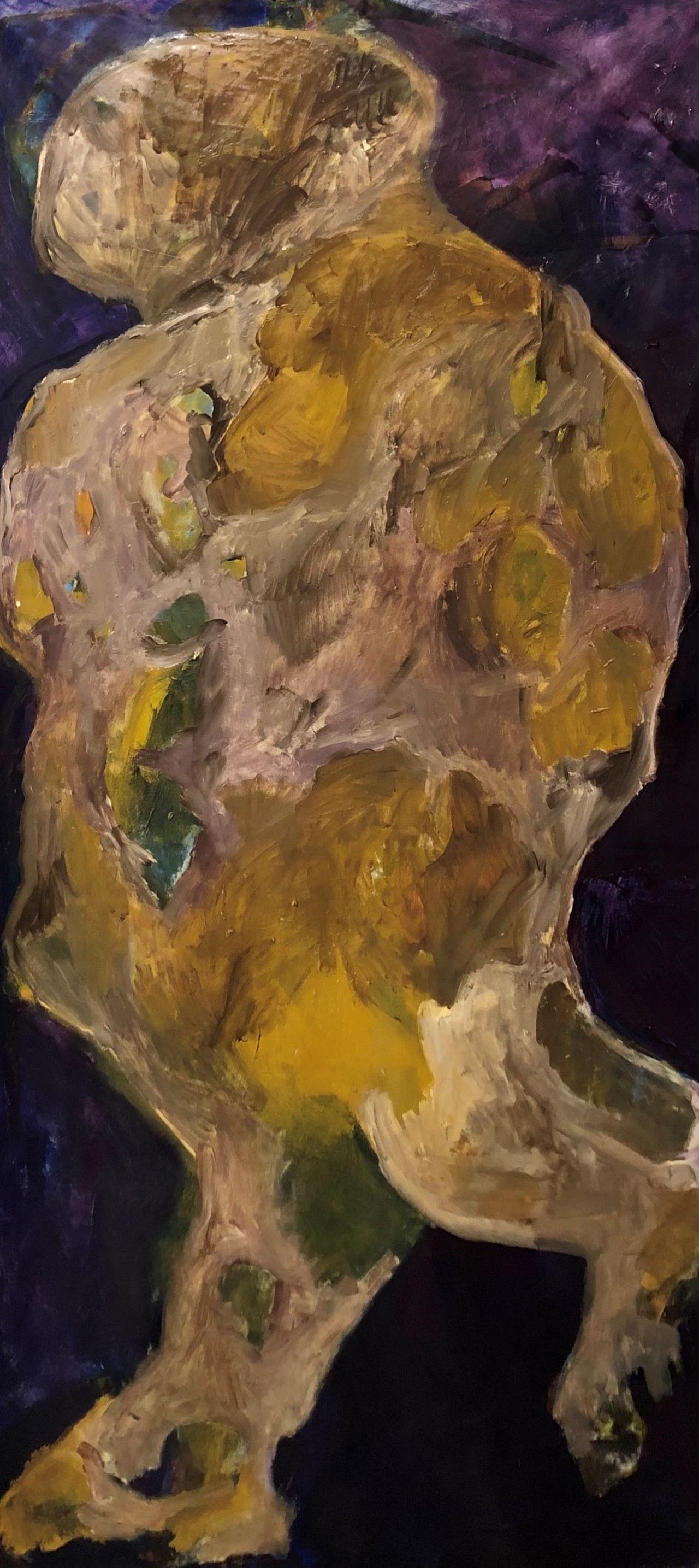 The subject is more figurative and defined, created with oil and acrylic, with clay tones prevailing—as if the being has been definitively shaped.