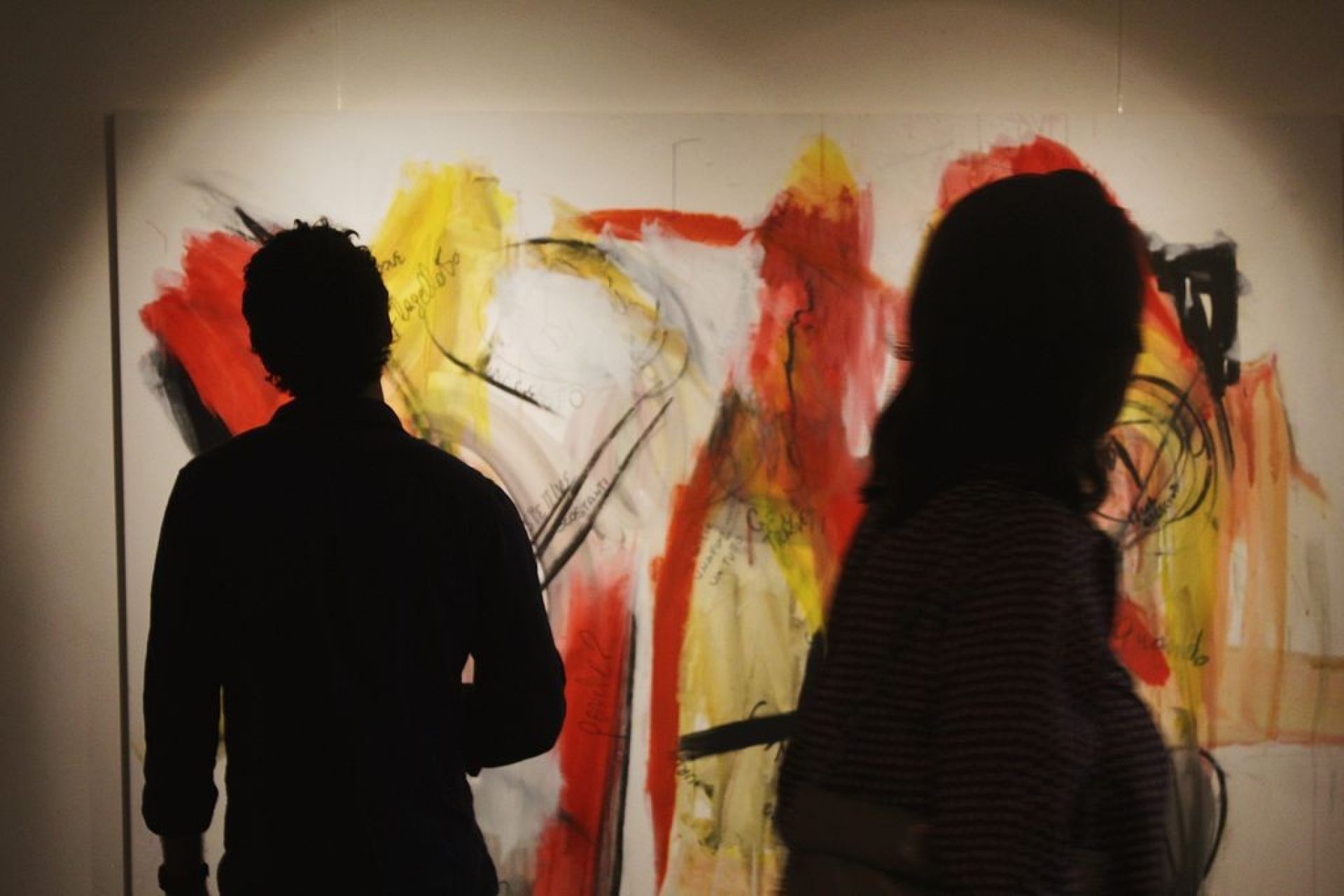 In some works, the textual component is executed using an alcohol-based graphic proof ink that evaporates upon contact with fixative; some already show the fading patina that suggests their perishable nature. Conversely, the pictorial component is fixed on canvas.