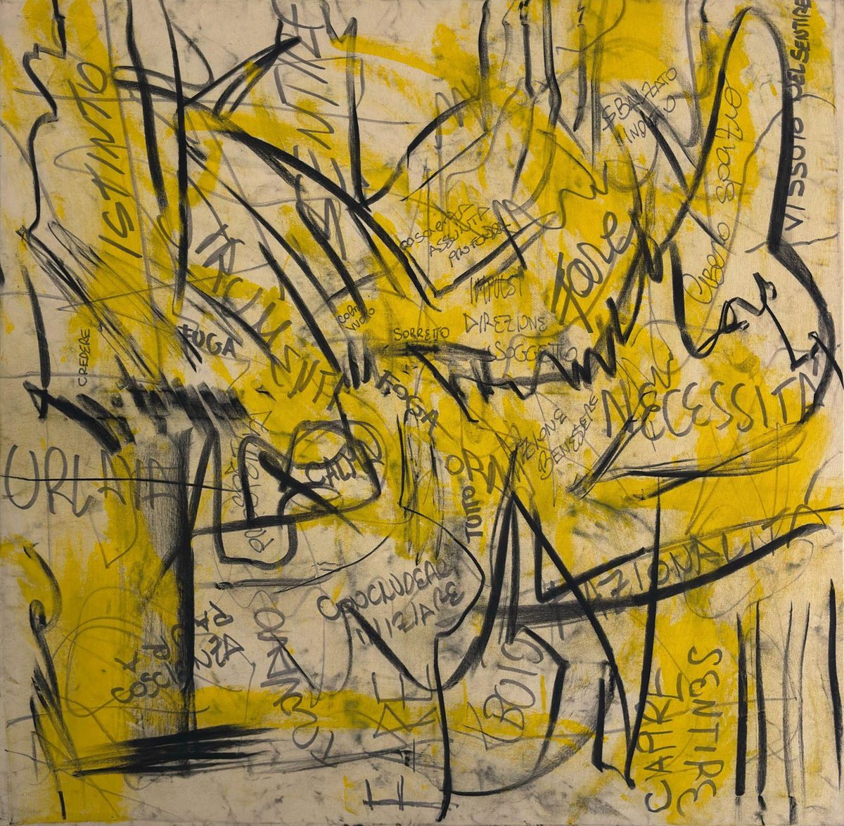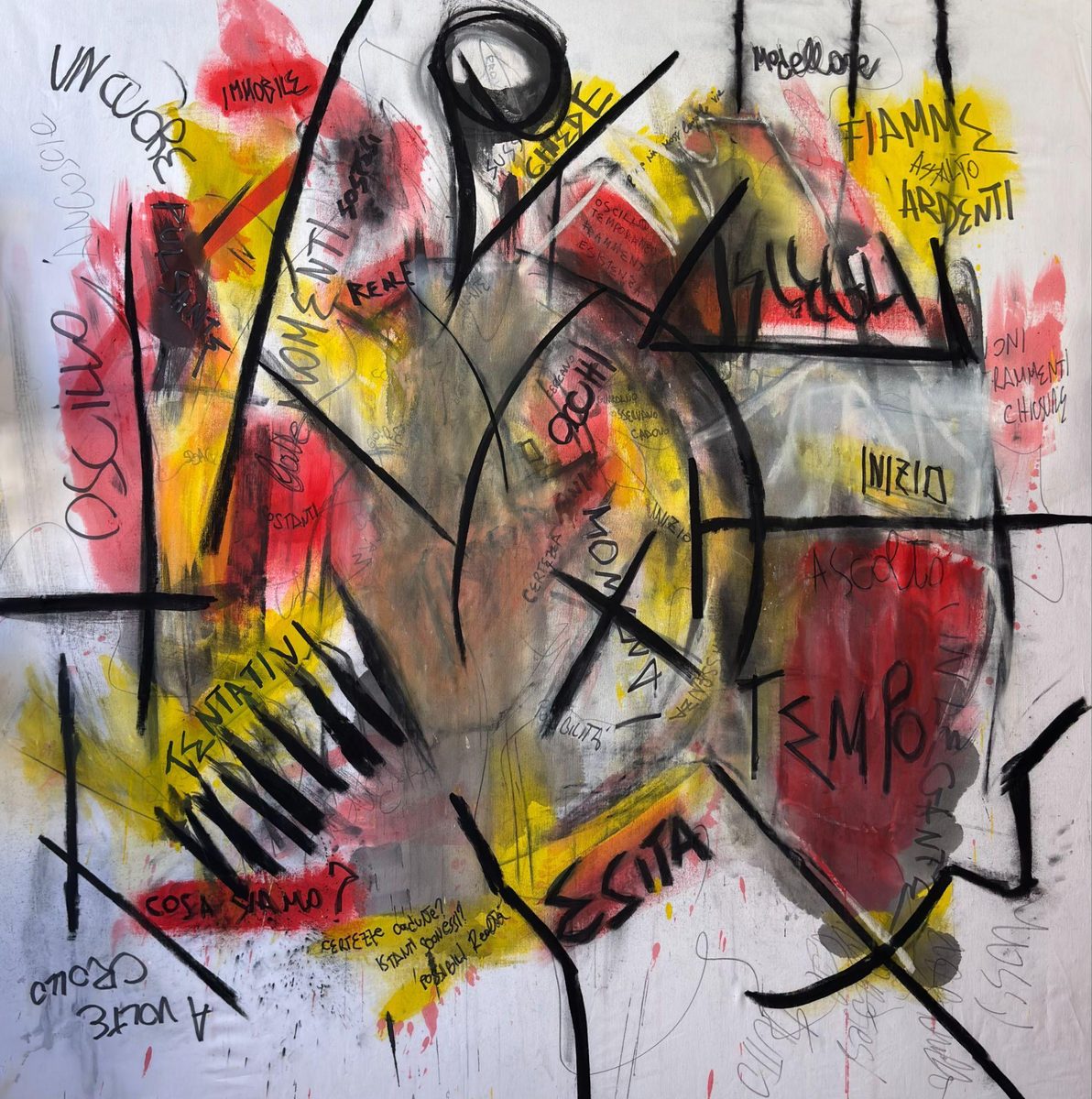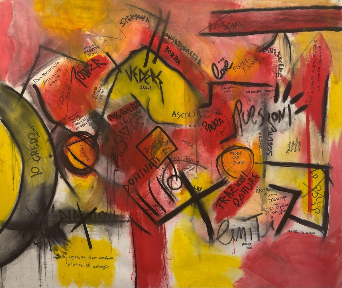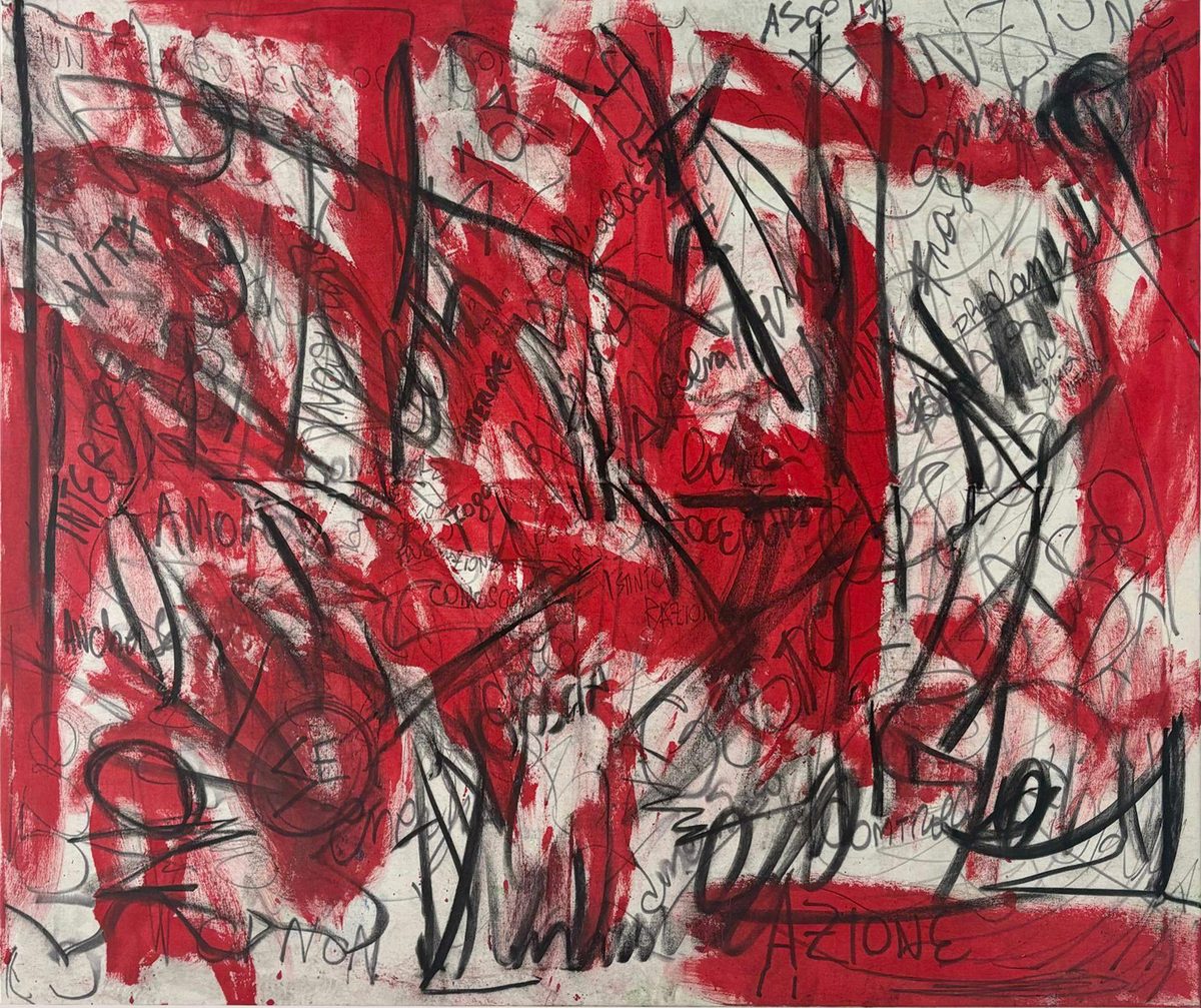 The creation of the works stems from an intense process of identification: a silent and gradual struggle with the canvas, aimed at returning what he calls “flows,” the inner movements emerging from within, in a continuous alternation between excess and stillness, impulse and control, instinct and reason.