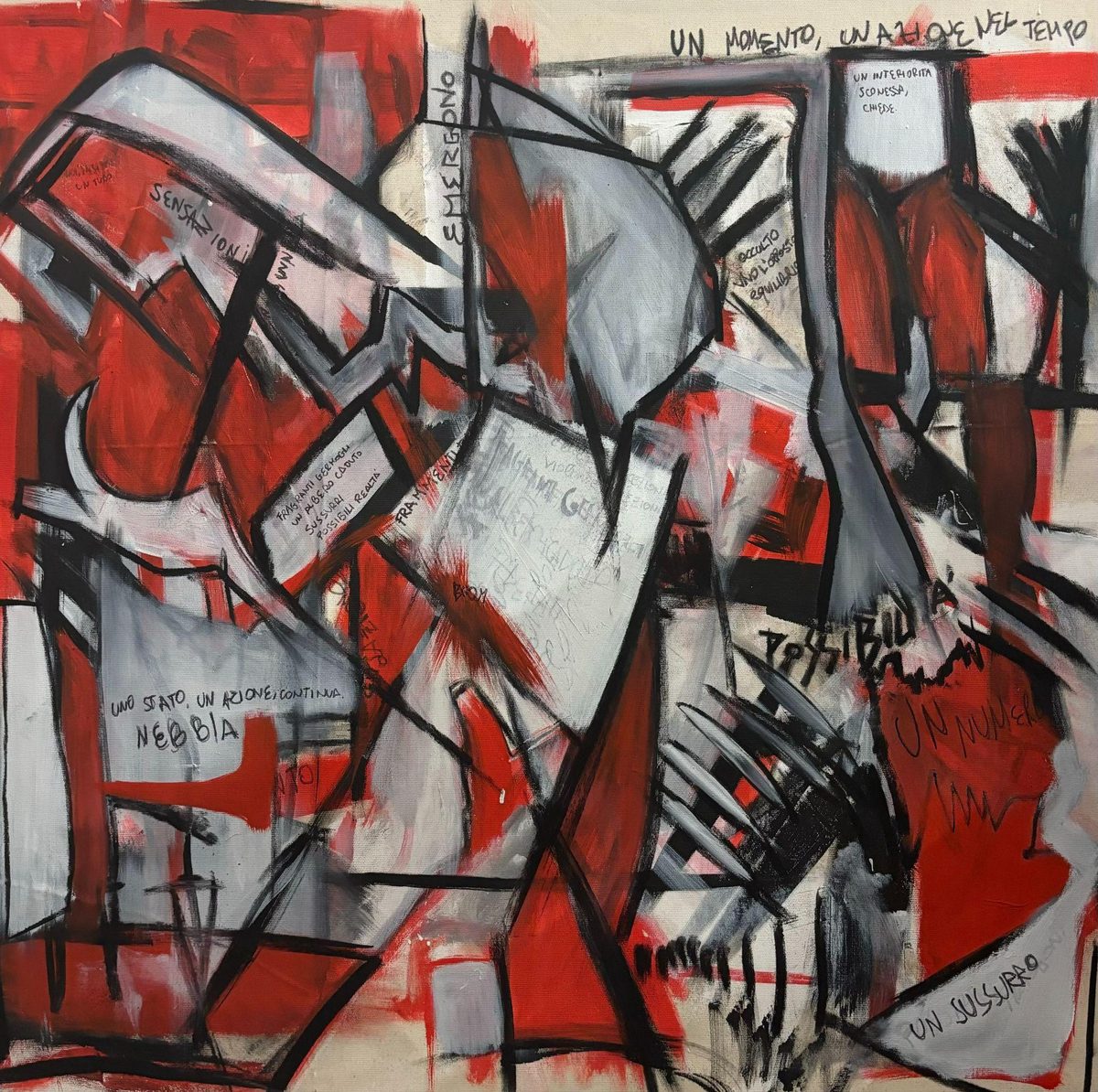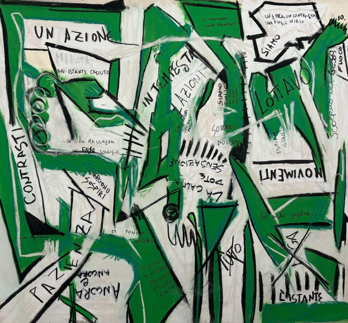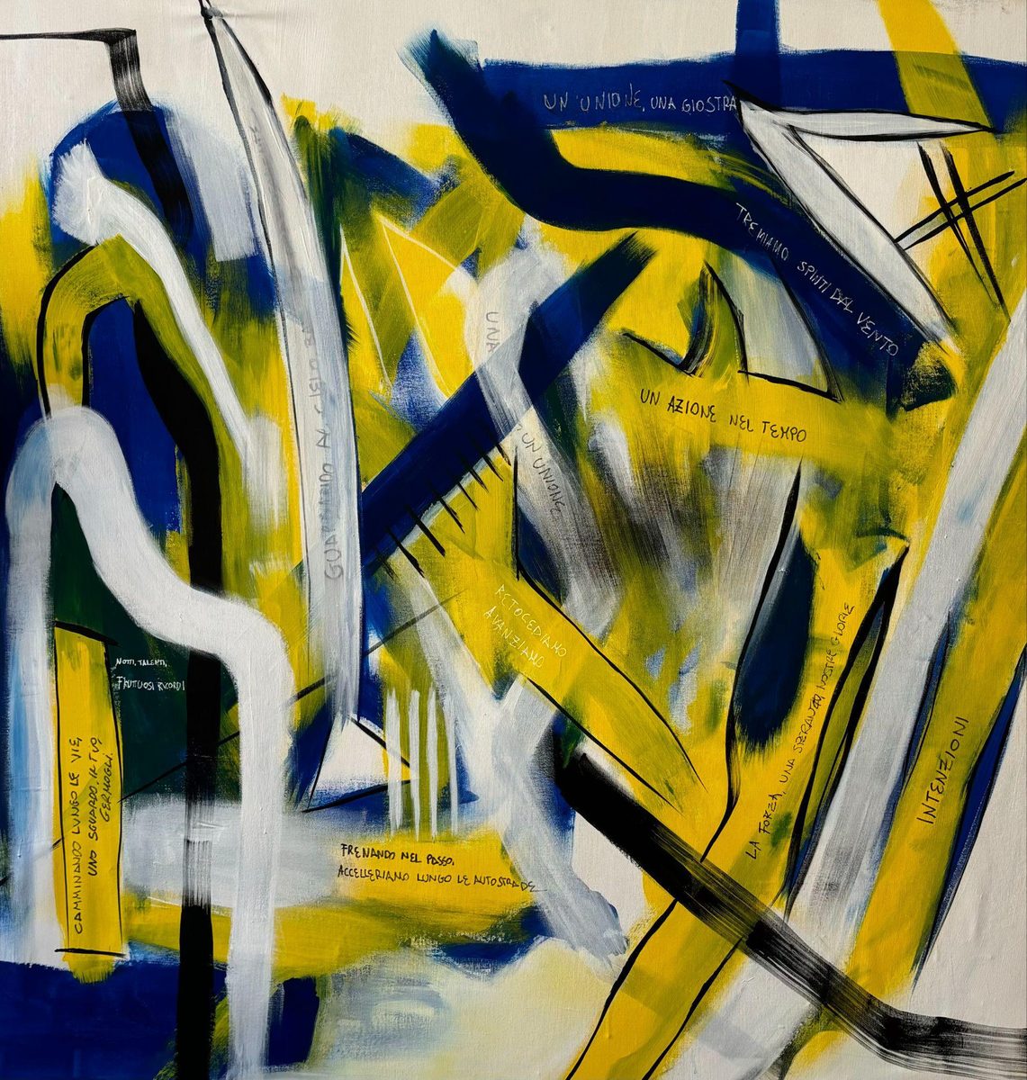 The creation of the works stems from an intense process of identification: a silent and gradual struggle with the canvas, aimed at returning what he calls “flows,” the inner movements emerging from within, in a continuous alternation between excess and stillness, impulse and control, instinct and reason.