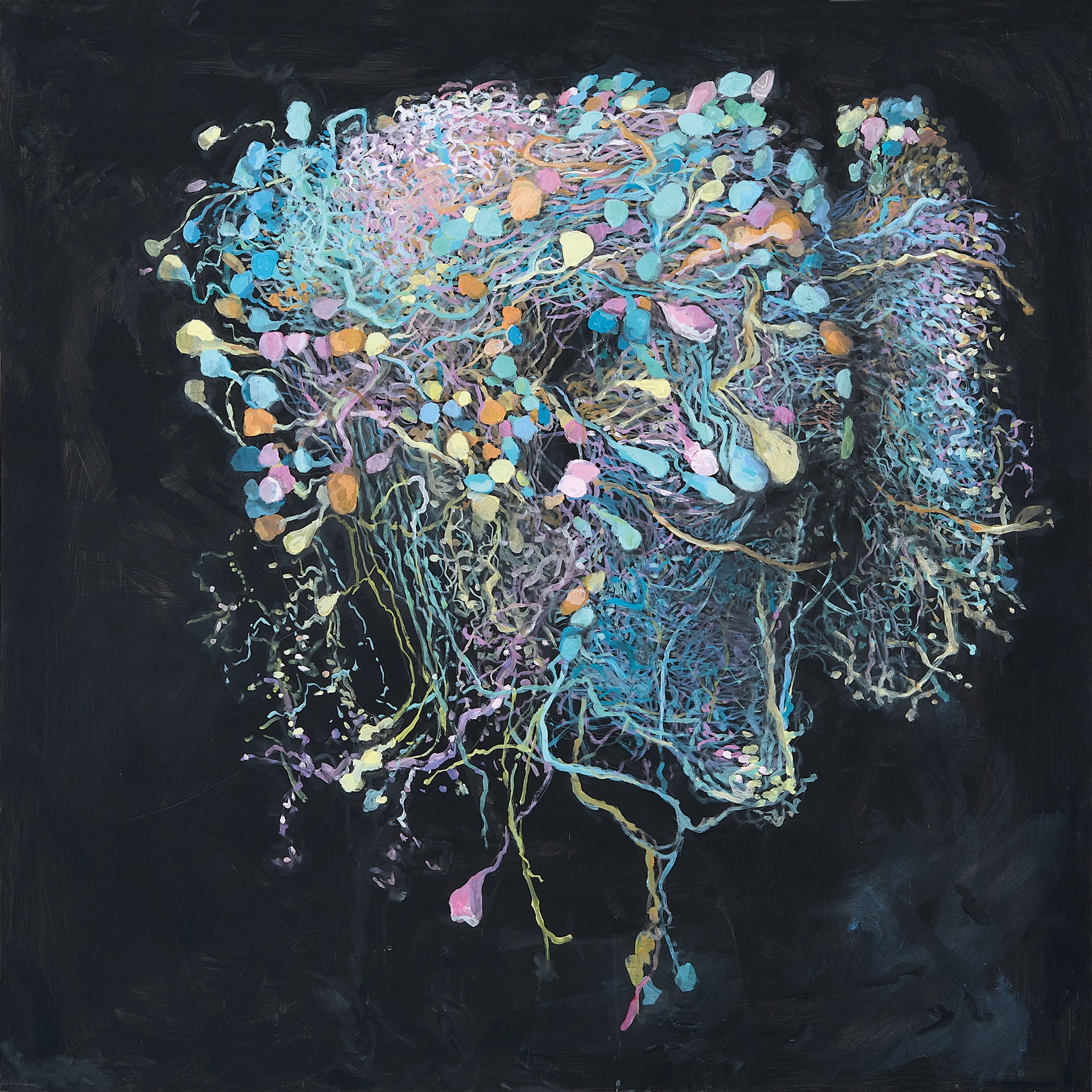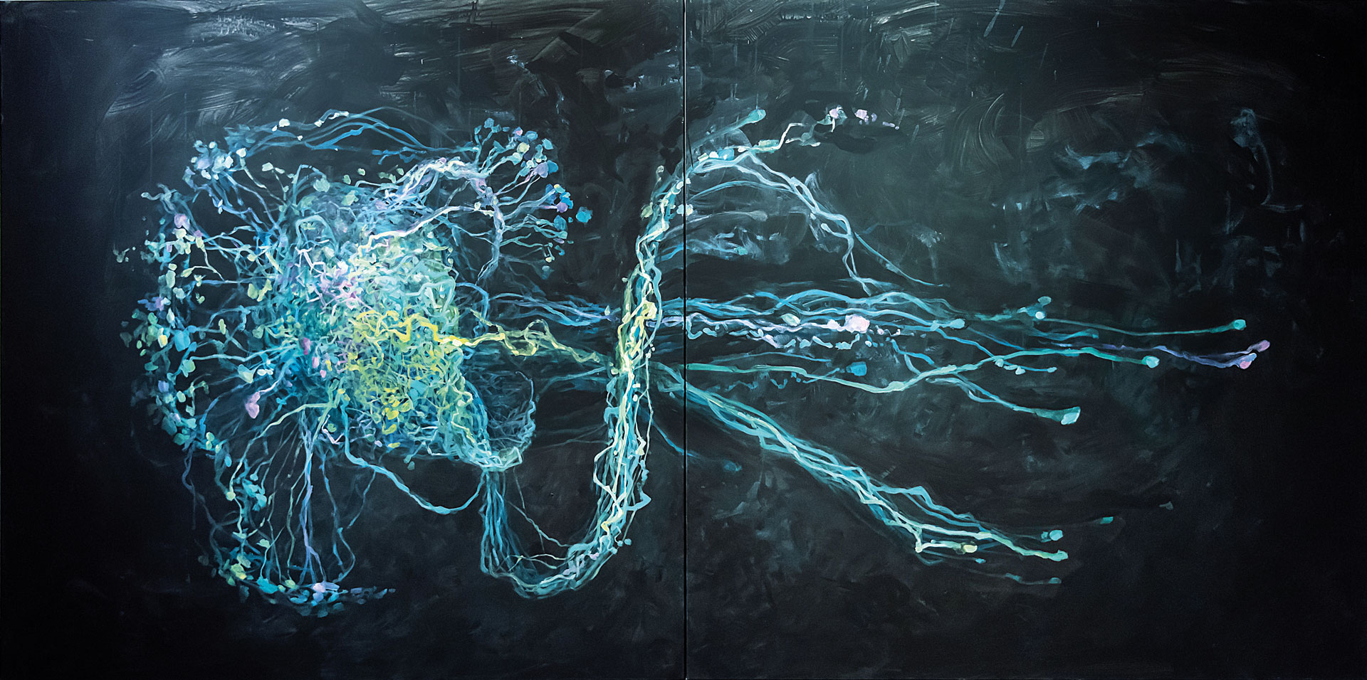 The painted works, seemingly shifting strips of color on an abyssal black base, take us to the ocean depths and encode the vortices of these sound waves, while also evoking the vast plastic islands increasingly floating like a macabre dance in our oceans. True islands of color but also of death.