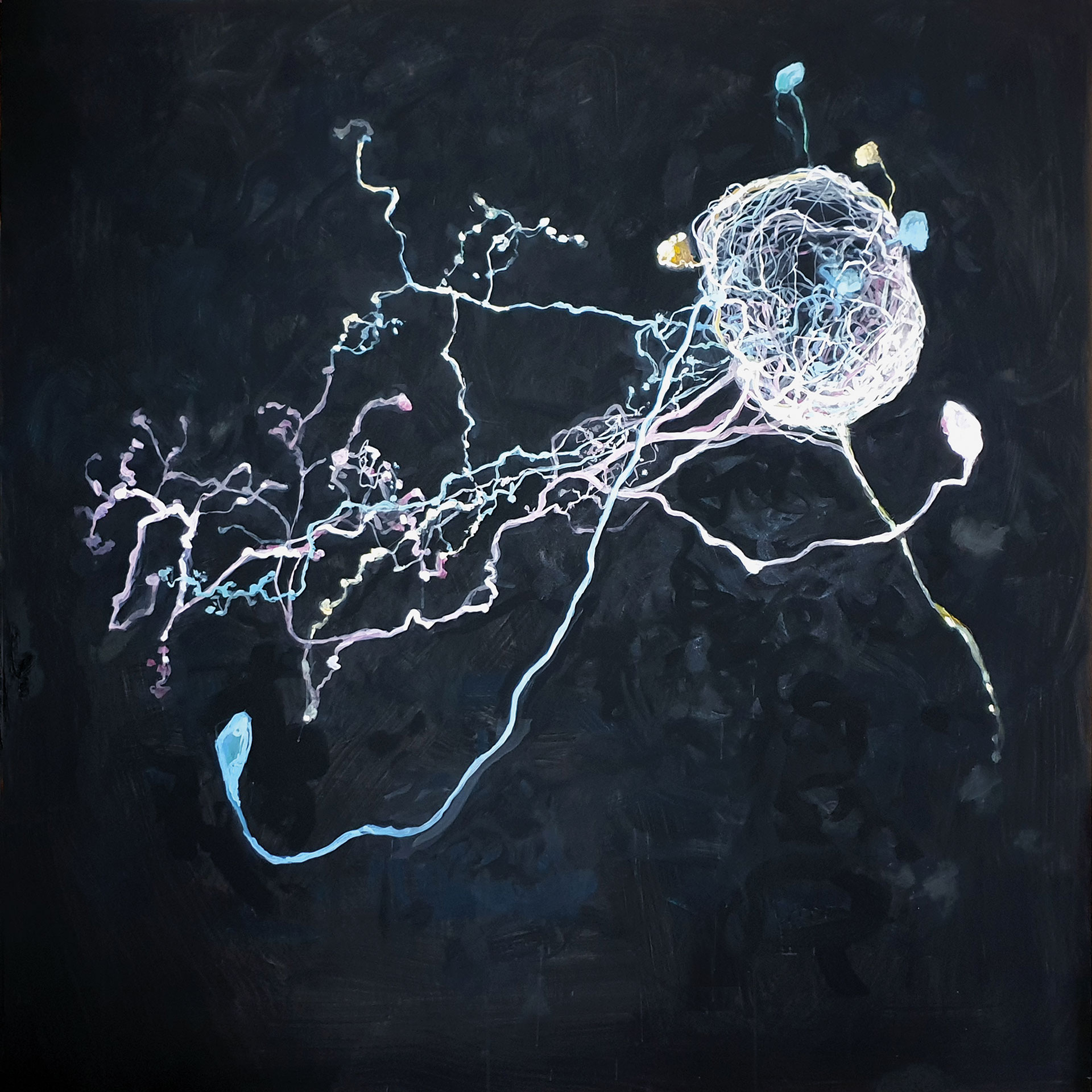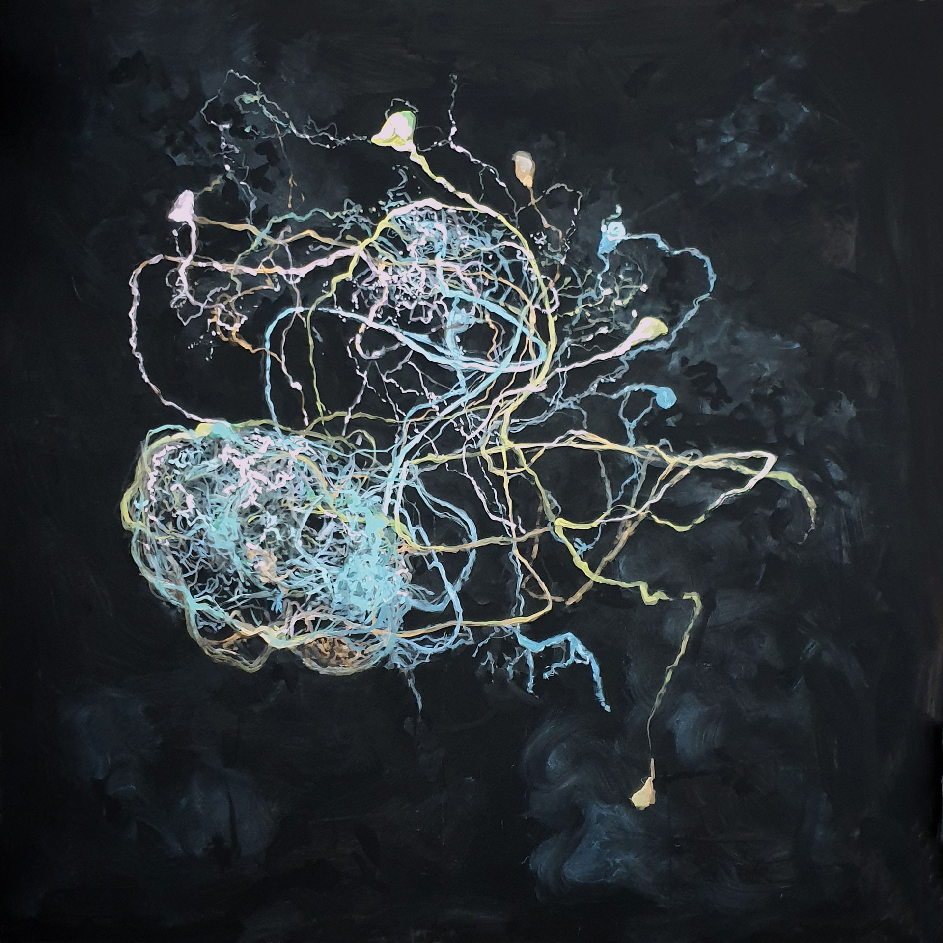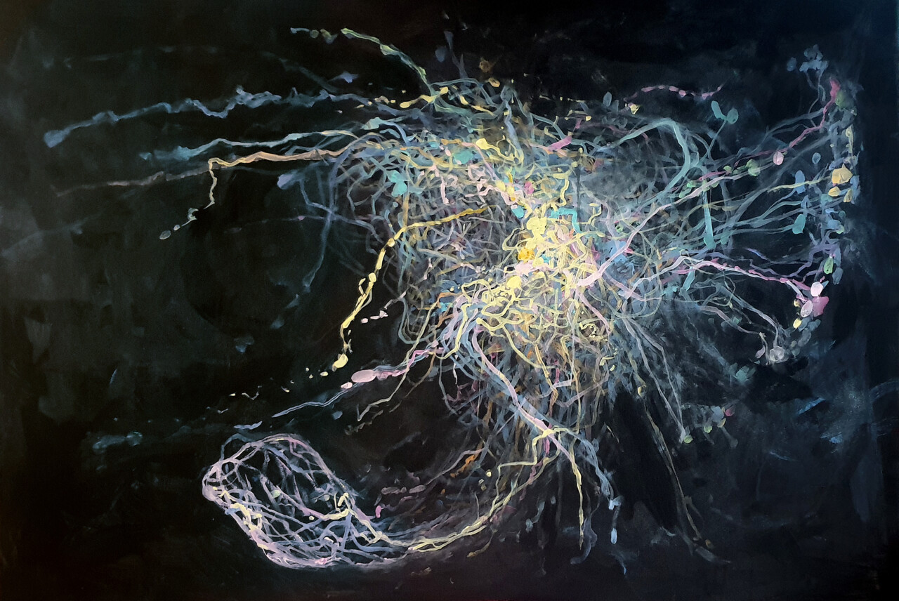 Among these artists stands the multifaceted figure of Alessandro Zannier, a conceptual artist working with music and visual arts, bridging physics, environment, and big data, with multimedia works and concerts. He will present in his first solo exhibition in Rome a cycle of paintings and a multimedia installation entitled “Hyper objects”, compelling us to reflect on issues such as the comatose state of the oceans, where sound waves generated by ship movements constitute acoustic pollution, seriously endangering numerous animal species, alongside other highly impactful human phenomena on the environment and global society.