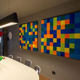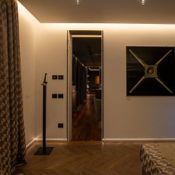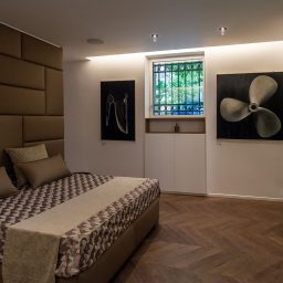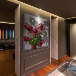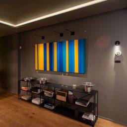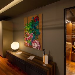In the "meeting room," the atmospheres of color by Piero Mottola, born from his research on human emotion, lead the viewer into a creative situation where they themselves become participants on an emotional and interpretative level, discovering fascinating and surprising inner worlds. In the "living area," the flowers painted with strong, vivid brushstrokes on coffee sacks by Hannu Palosuo create a relationship between art and life — a regeneration of human cycles that shape our history and present. The flowers embody the constancy of time; they bloom and slowly leave behind their transformation, in reality, our most beautiful memories. In the "night area," the artist Costanza Alvarez de Castro stages the contradictions of imagination, emphasizing color and the layering of material that resolves the surface through tones and chromatic suggestions. Her world of common objects evokes a sense of emotional calm and accompanies us in everyday life. Binding the different rooms together are the bronze sculptures by Francesca Tulli, whose unexpected material combinations form a clear essence of integrity and compositional balance. Through a wisely arranged spatial composition, they help us to better reconsider our notion of space.