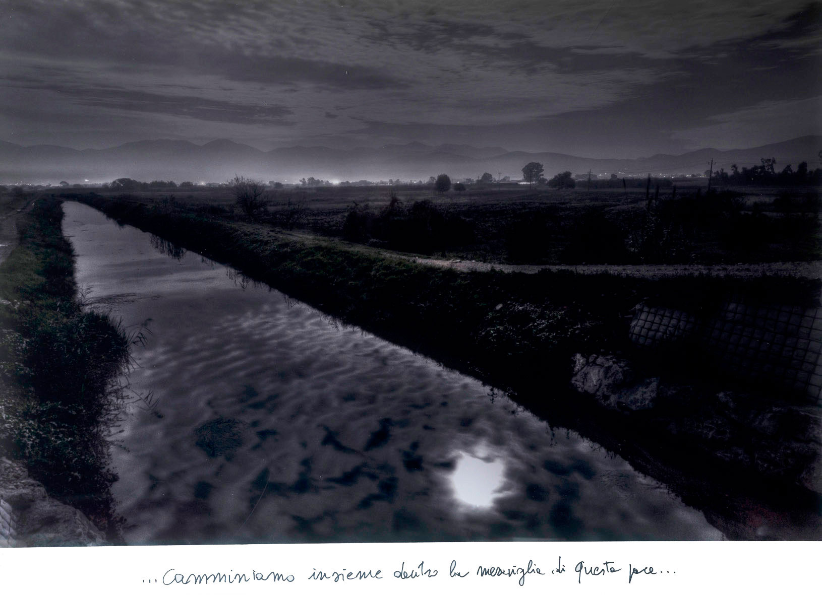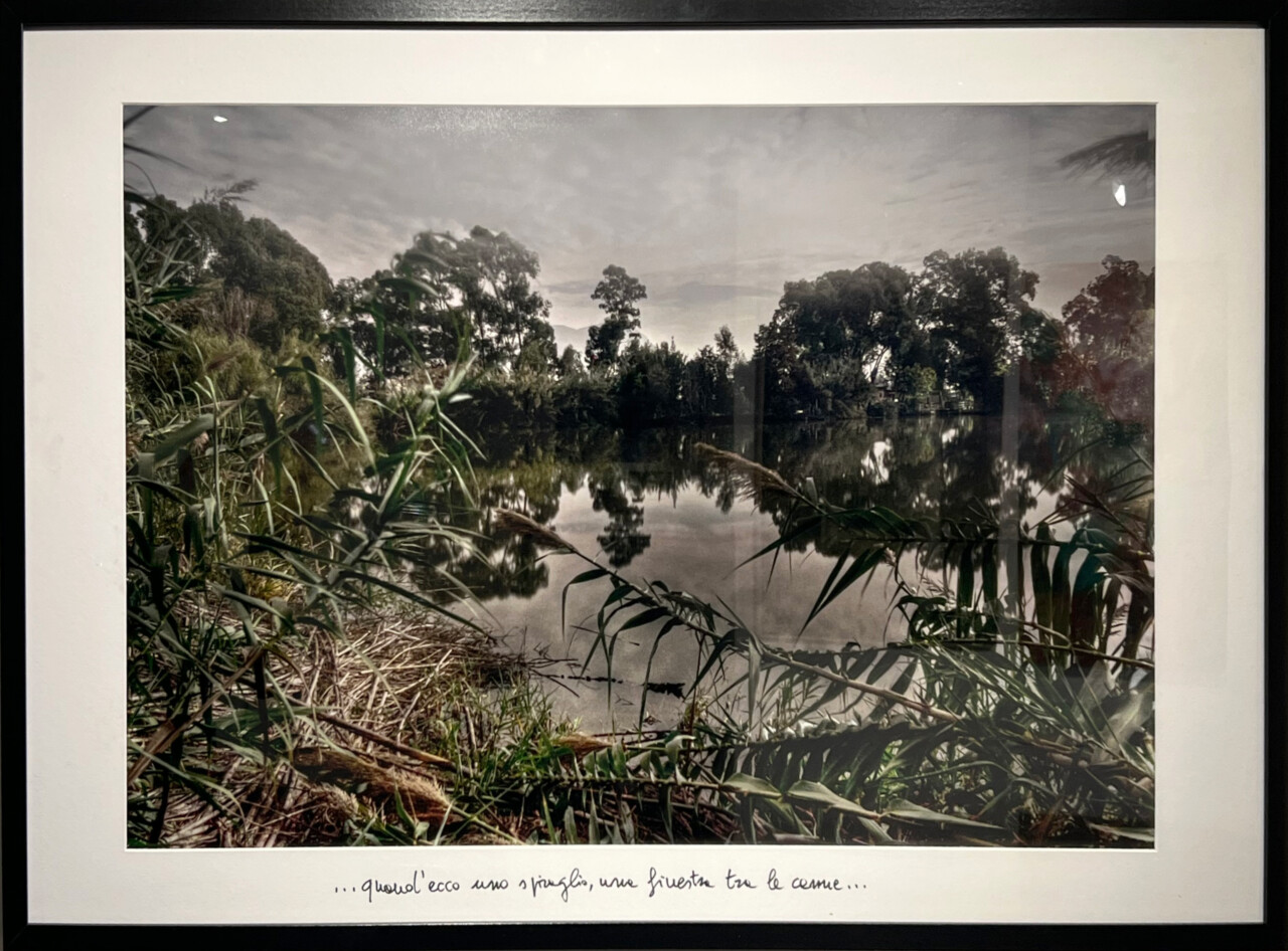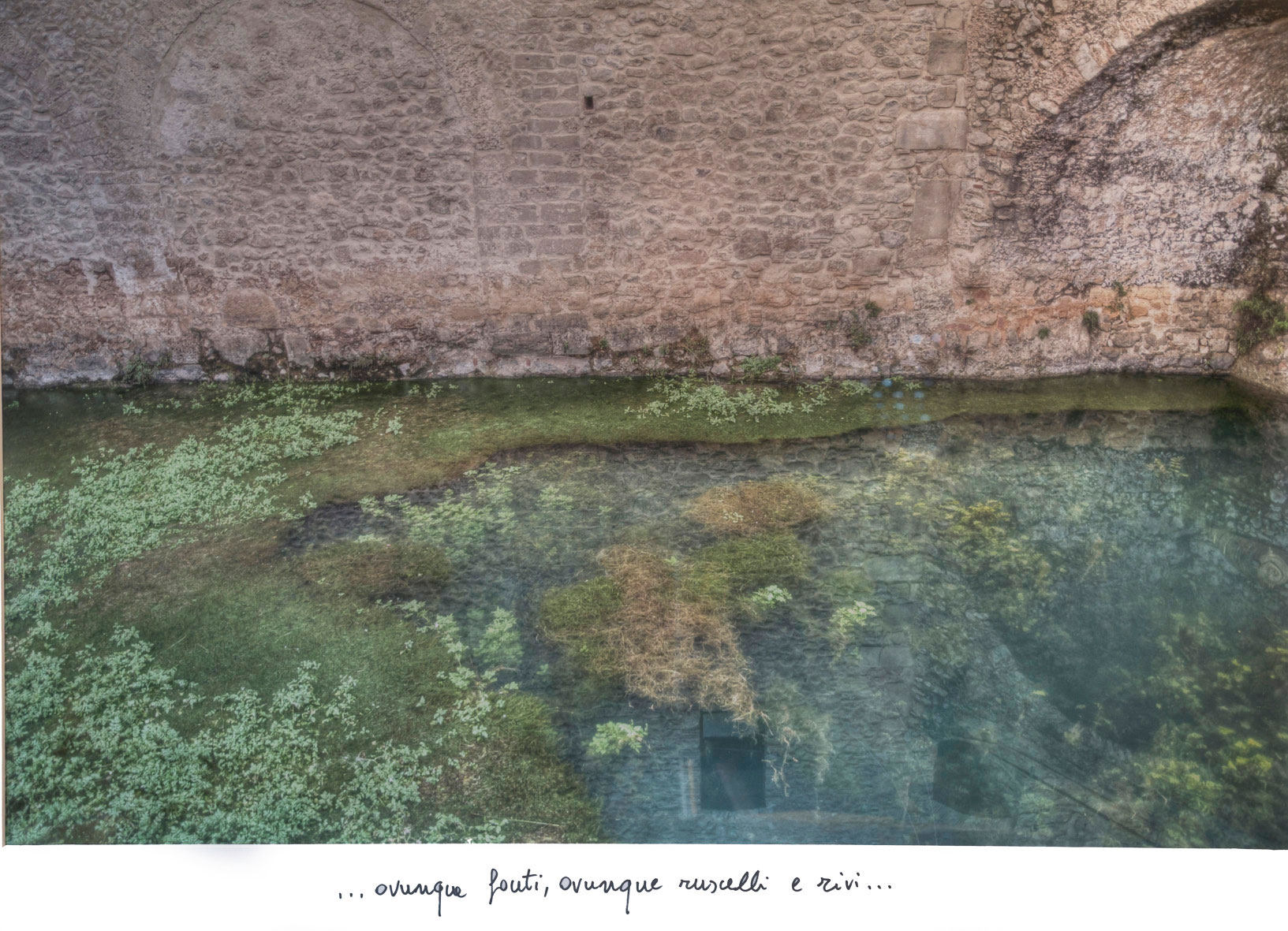 Created with a digital camera and processed in postproduction. Printed on chemical paper, 50x75 cm, guaranteeing over 100 years of durability, mounted on a 60x90 cm mat where the poet Claudio Damiani handwrote verses composed specifically for the book “Water Paths,” published by the Libero de’ Libero Association of the Municipality of Fondi. Thus, the complete artwork is considered 60x90 cm.