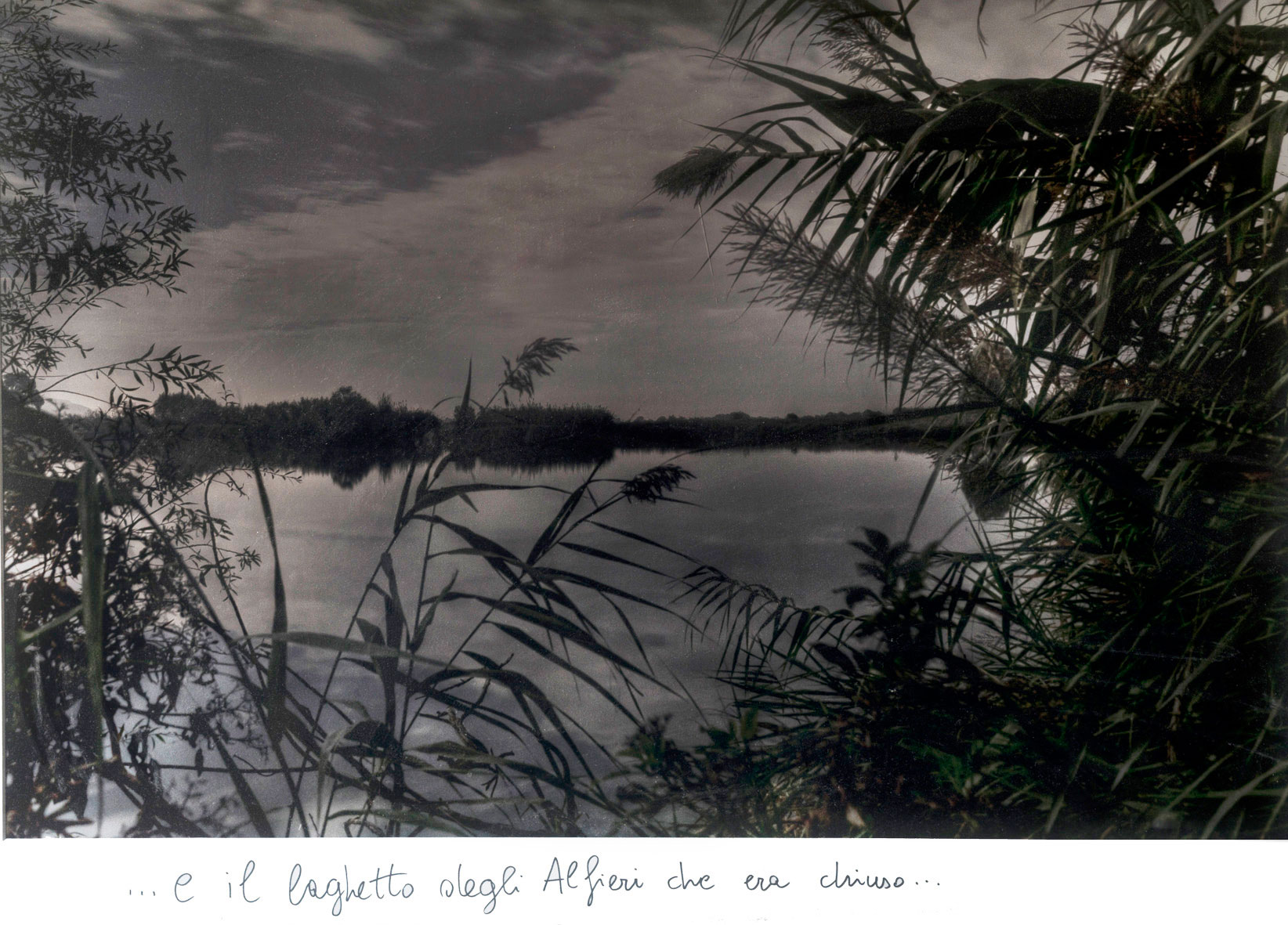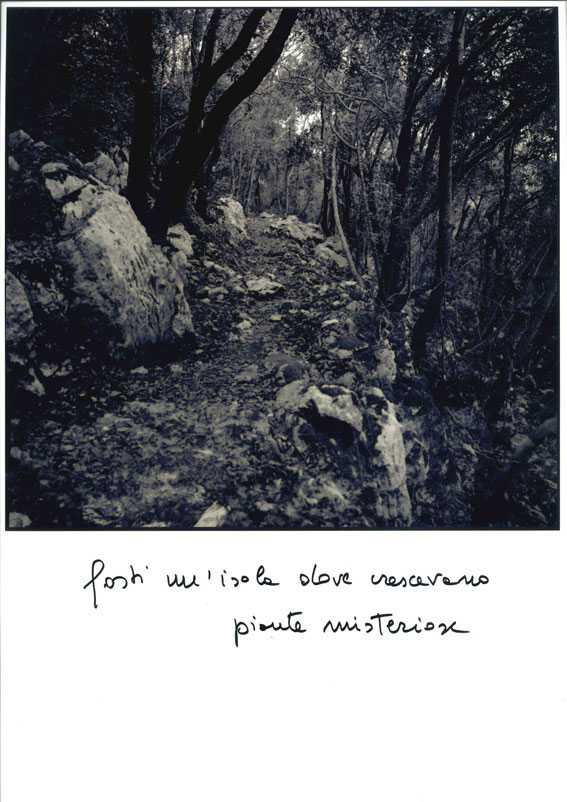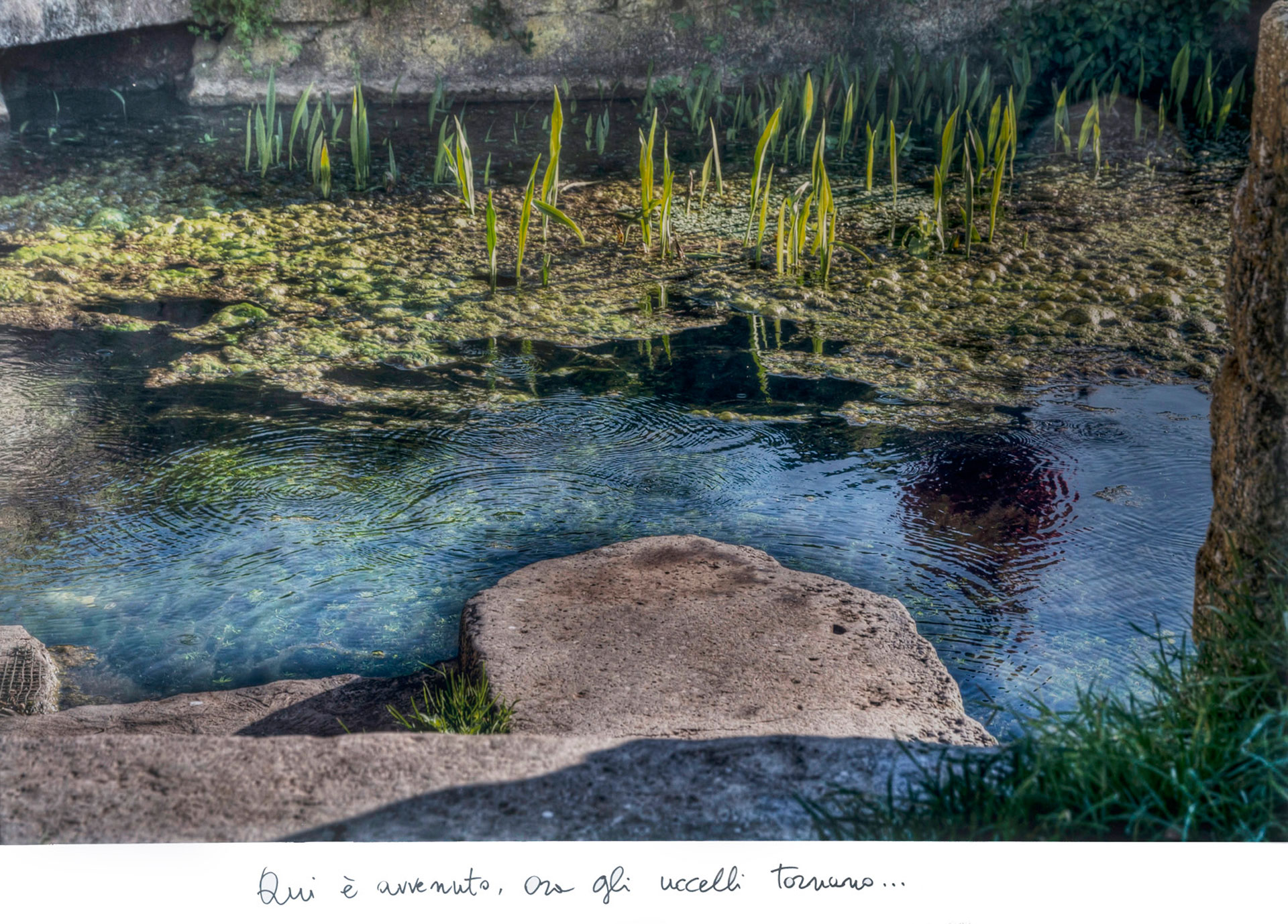 Created with a digital camera and processed in postproduction. Printed on chemical paper, 50x75 cm, guaranteeing over 100 years of durability, mounted on a 60x90 cm mat where the poet Claudio Damiani handwrote verses composed specifically for the book “Water Paths,” published by the Libero de’ Libero Association of the Municipality of Fondi. Thus, the complete artwork is considered 60x90 cm.