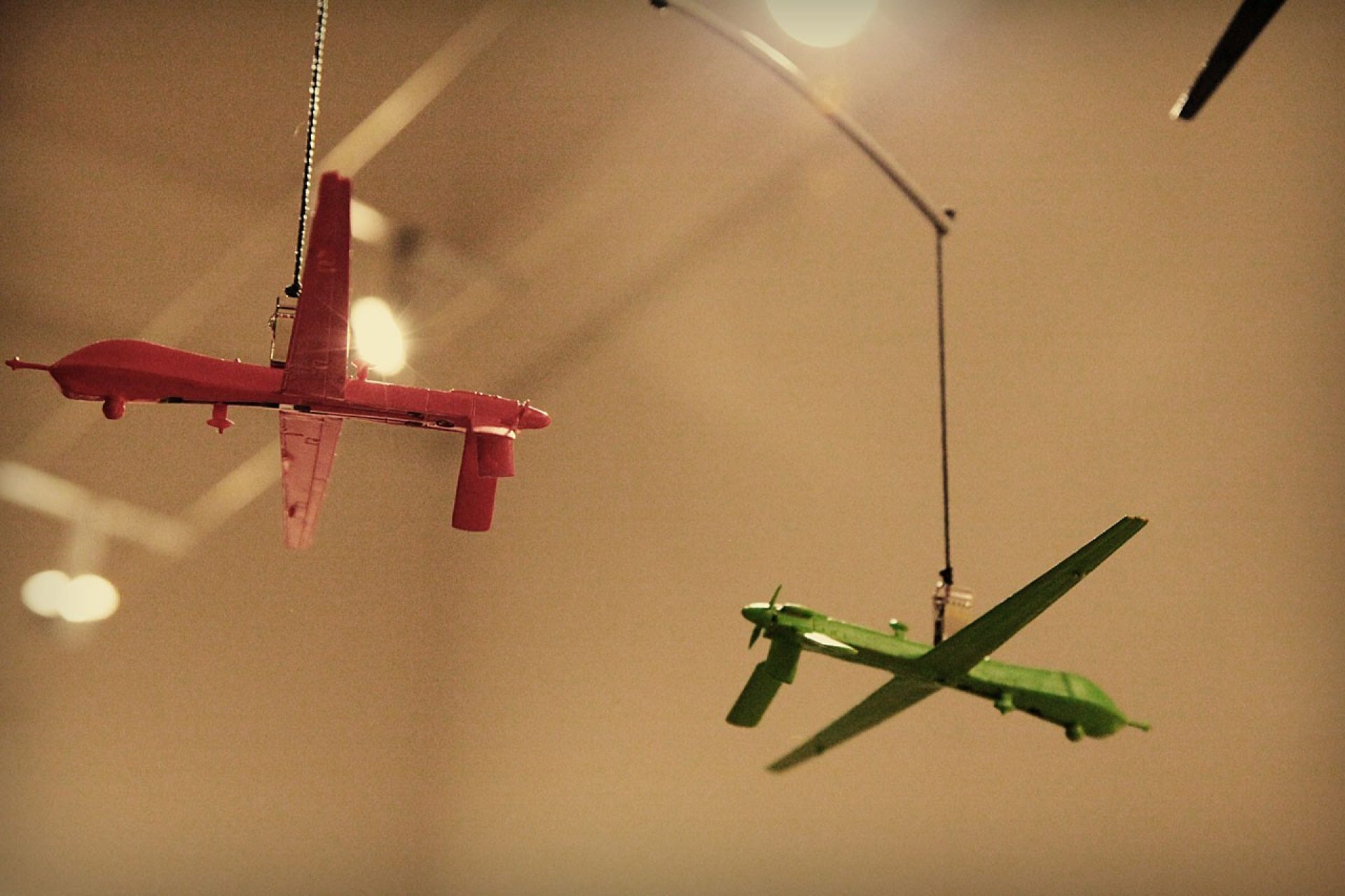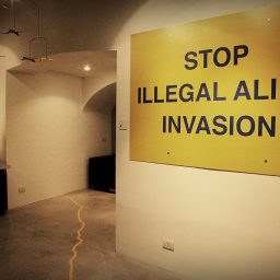 Although the installation does not show migrants directly, the work narrates their persistence through the contrasting action of the opposing side, emphasizing that it exists only as a counterbalance. This triggers the macabre game: drones—used to monitor migratory movements along borders—become a mobile carousel, hovering over those who cannot sleep, projected onto a frontier yet to be constructed (during the inaugural performance), contrasted with its ideal dismantling through continuous crossings. On the wall, the sign “Stop Illegal Alien Invasion” plays with English words: referring to undocumented migrants while winking at an alien invasion from a superficial translation.